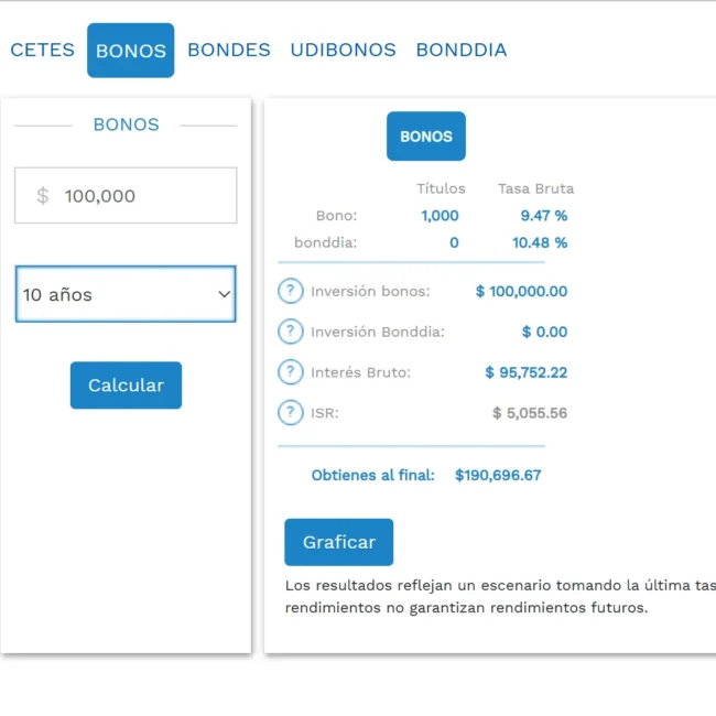 Sehr praktisch ist auch der Zinsrechner auf der Cetesdirecto Website. Zu beachten ist dabei, dass die meisten Anlageprodukte einen variablen Zins (Kupon) haben. Insbesondere bei langfristigen Anlagen sind die Renditeaussichten somit ehr indikativ